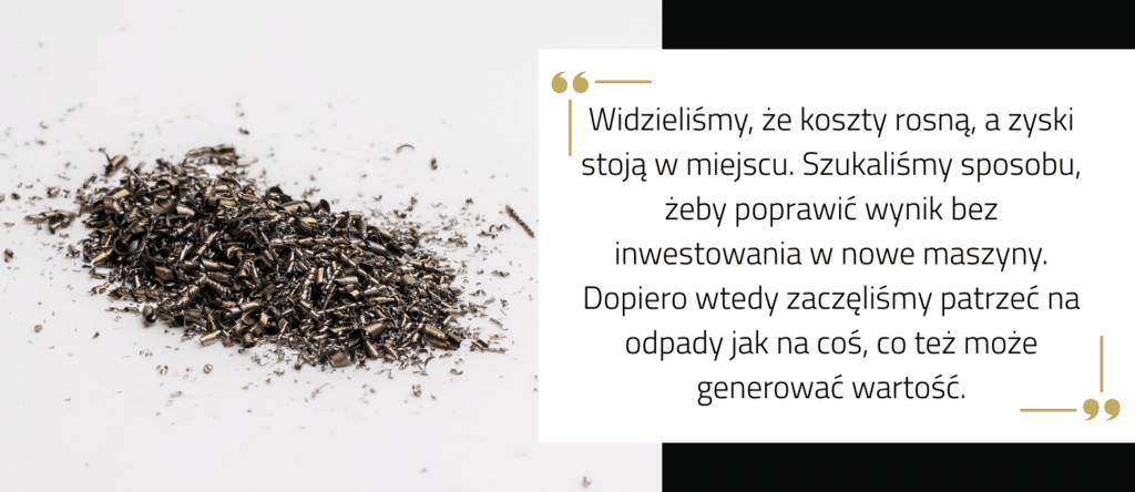 Optymalizacja zbierania wiórów przy stanowiskach obróbczych Wdrożono system selektywnej zbiórki wiórów, który zapobiega mieszaniu różnych gatunków stali. Pracownicy przeszli szkolenia, a stanowiska pracy dostosowano do nowych zasad, zwiększając zarówno bezpieczeństwo, jak i wartość odzyskiwanego materiału.