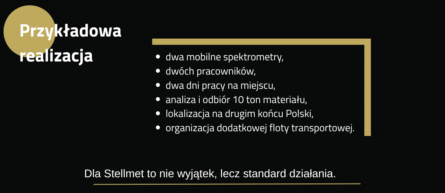 Już w 2011 roku Stellmet jako pierwszy w branży wdrożył mobilne spektrometry oraz sortowanie materiałów na miejscu u klienta, z wykorzystaniem legalizowanych wag. Rozwiązania te, początkowo postrzegane jako niestandardowe, dziś stały się rynkowym minimum, wdrażanym przez konkurencję dopiero po latach.