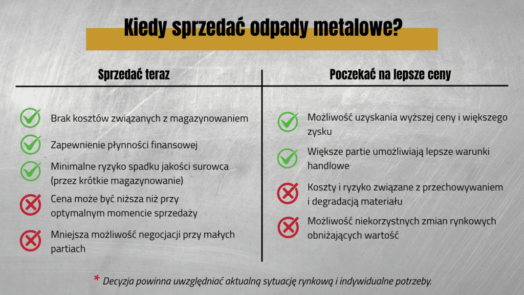 W praktyce zdarza się, że oczekiwanie na korzystniejsze warunki cenowe kończy się stratą – złom traci na wartości przez nieprawidłowe przechowywanie, segregację lub wahania rynku, które następują szybciej, niż zakładano. Zarówno dla firm jak i osób prywatnych, które planują sprzedaż surowców cyklicznie, często lepszym rozwiązaniem okazuje się sprzedaż przy stabilnych cenach, zamiast ryzykownego magazynowania w oczekiwaniu na niepewny zysk.
